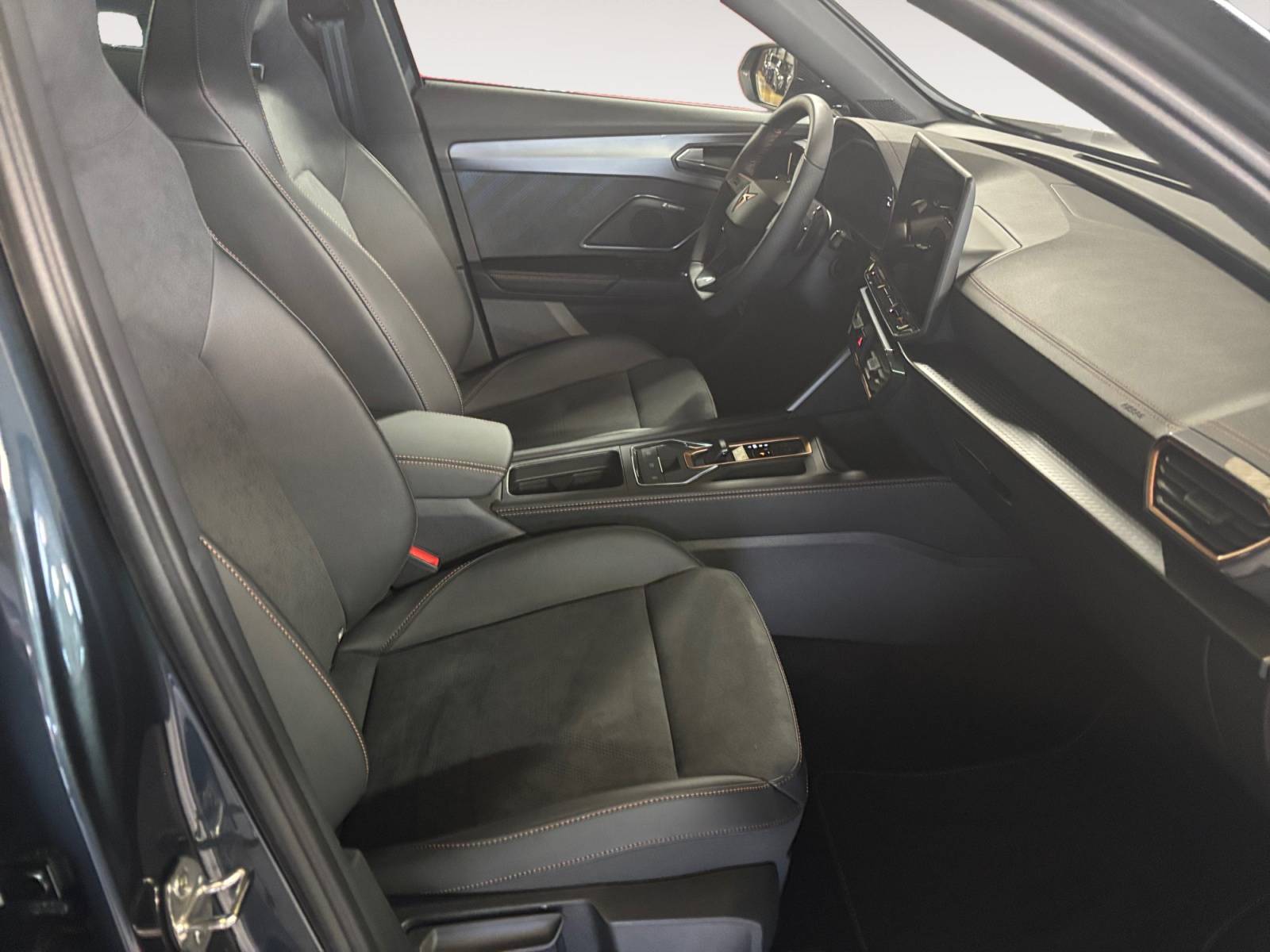 – Design intérieur Dynamic – Sièges baquets suédine Noir Asphalte avec poinçonnage et surpiqûres cuivrées – Logos CUPRA estampés sur les appuie-têtes – Planche de bord noire surpiquée avec inserts Dark Alu – Contre-portes suédine noire avec poinçonnage Bleu Astral – Siège conducteur : chauffant avec réglage électrique à mémoire, y compris réglage lombaire – Siège passager : chauffant avec réglage manuel de la hauteur