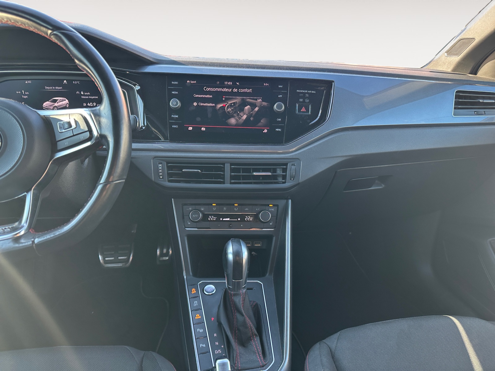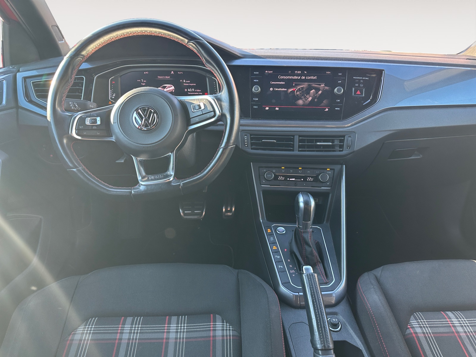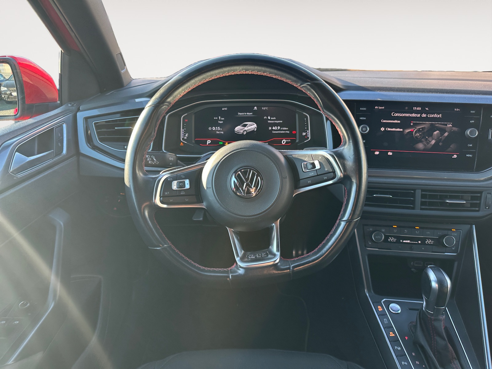 – Volant spécifique GTI multifonctions avec plaqages en chrome mat revêtu de cuir avec surpiqûres rouges et palettes de sélection des vitesses au volant